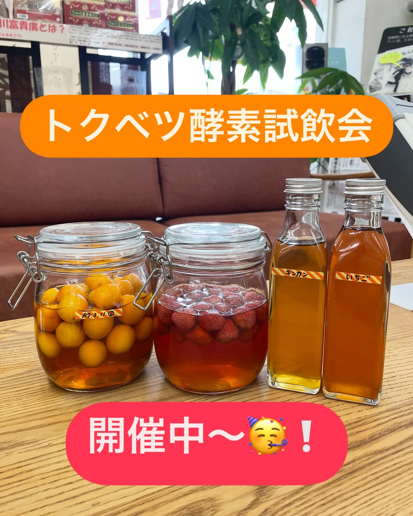 . 2025/04/05 . 今日は当店おすすめの酵素飲料試飲会の日!! いちご酵素やきんかん酵素など、アレンジ酵素はお子様にも飲みやすく大好評です🍓 炭酸割りでいかがですか〜? お気軽にお越しください♪ お待ちしております😊