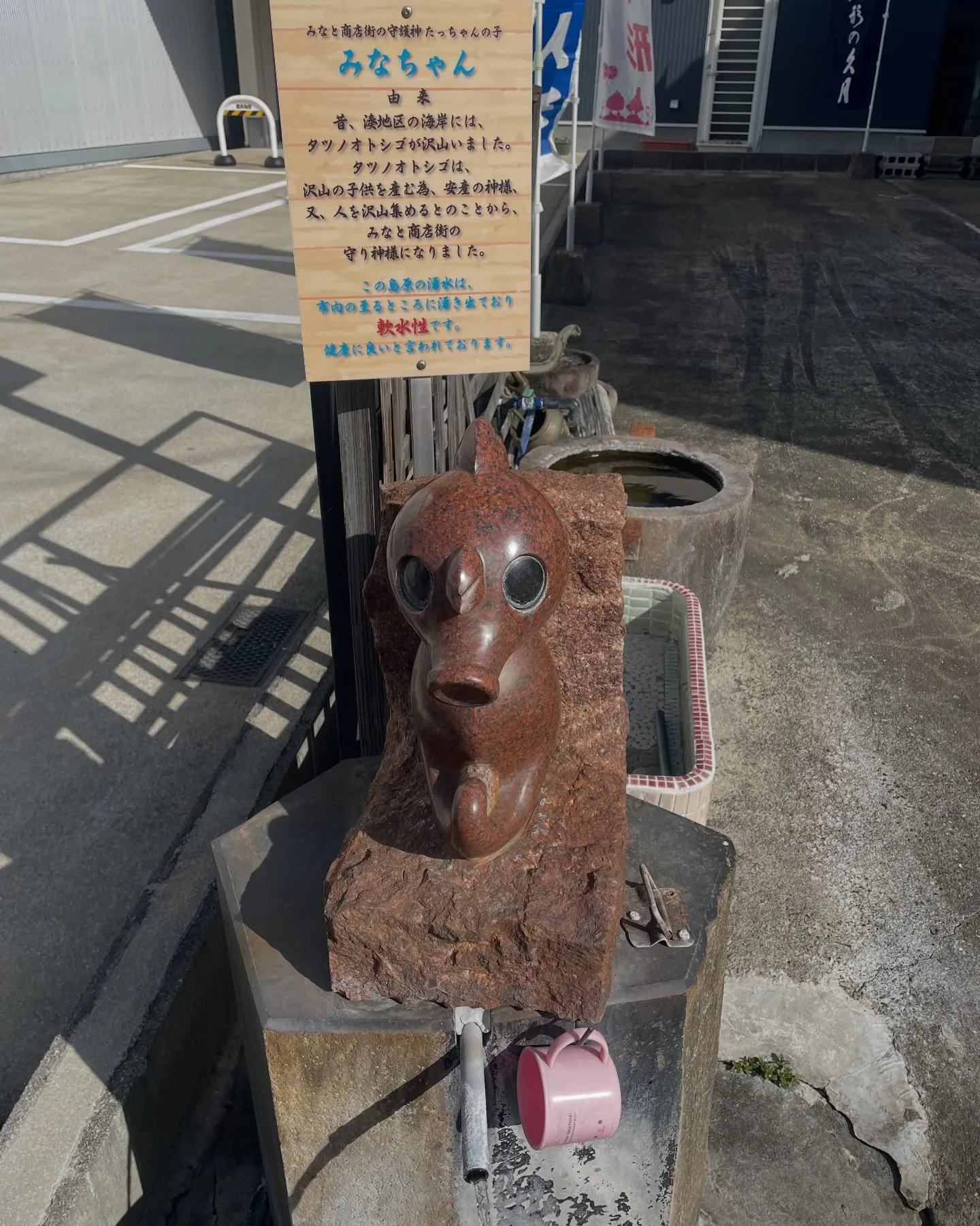 写真はしまばら薬局のすぐそばにある、みなと商店街の守り神たっちゃんの子「みなちゃん」です。